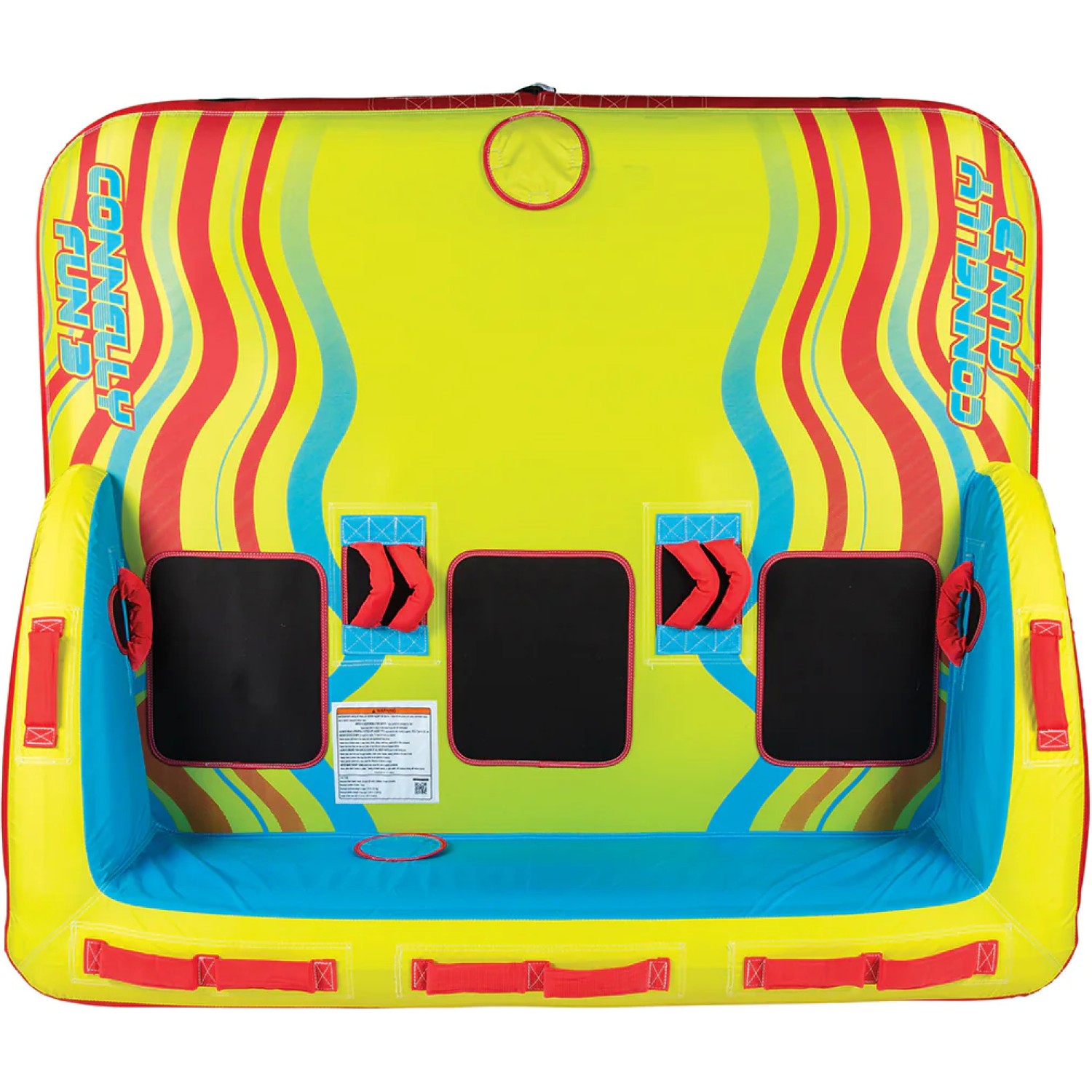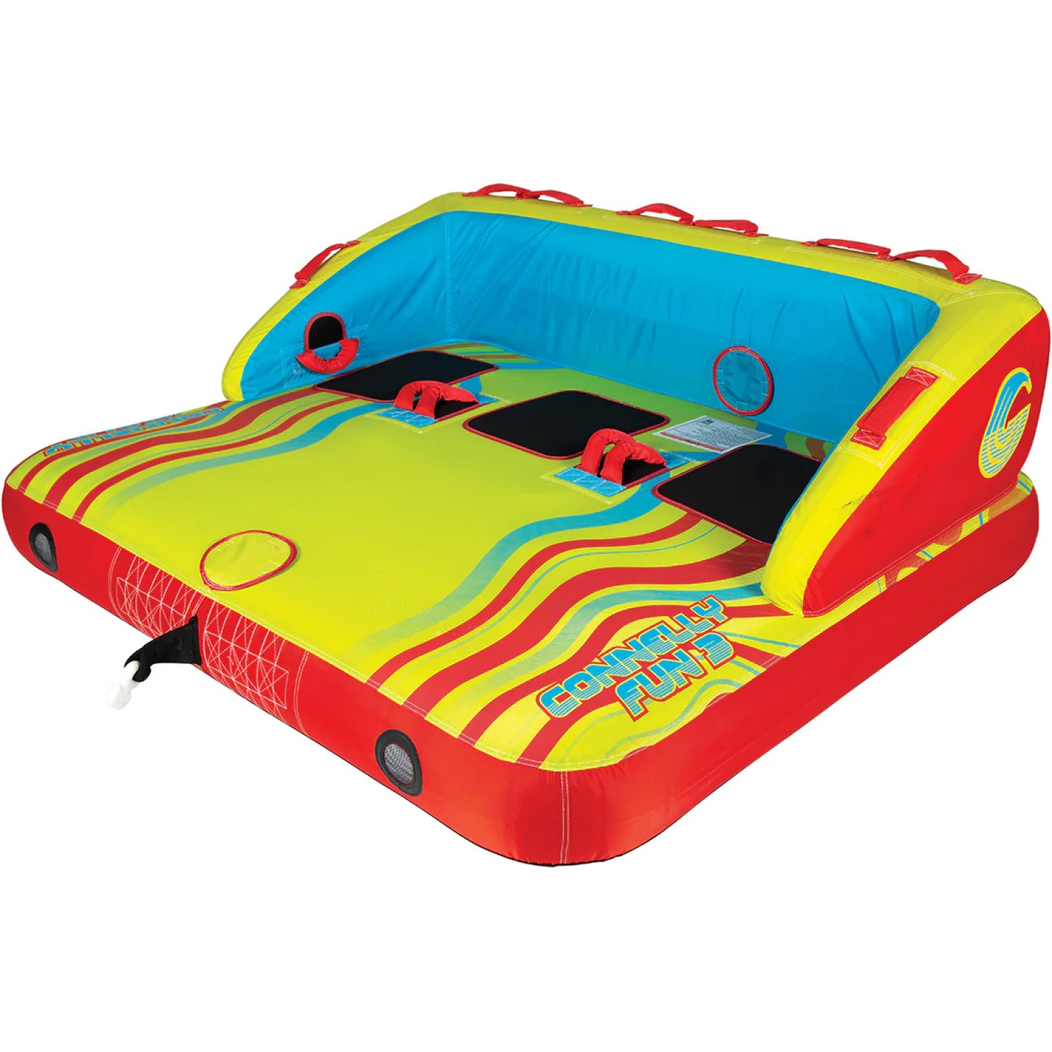 The Connelly Fun 3 is a versatile two-way towable tube built for thrilling, action-packed rides with up to three riders. Measuring 65" × 78", it offers the choice between a relaxed couch-style ride or an exciting kneeling chariot position. Two-Way Tow technology provides excellent control and stability, while the durable 840D nylon cover and heavy-duty bladder ensure long-lasting performance. Soft EVA seat padding keeps riders comfortable, and the padded handles and grab straps offer secure grip throughout the ride. With Boston valve inflation and a mesh drain bottom, setup and water drainage are quick and easy. A peel-and-stick repair kit and a 1-year warranty are included.