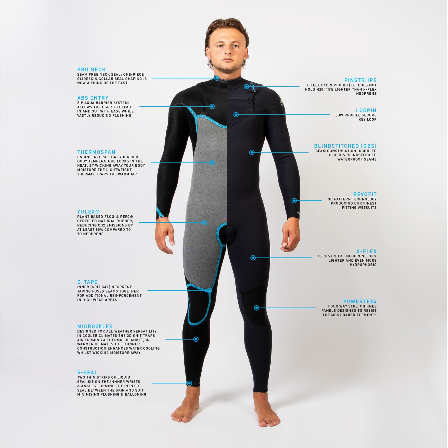 The Quadrate chest bib zip entry reduces flushing and improves flexibility across the back. S-Seal wrist and ankle cuffs lock in warmth, while the Pro GlideSkin collar creates a smooth seal against the neck. PowerTex4 knee pads reinforce high-wear areas, ensuring long-term durability for demanding surf conditions.
