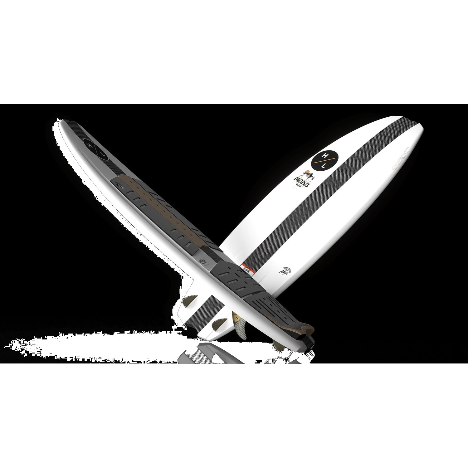 - Carbon & fiberglass custom MOAB fins: 2 × 4.5" front, 2 × 1.7" drop