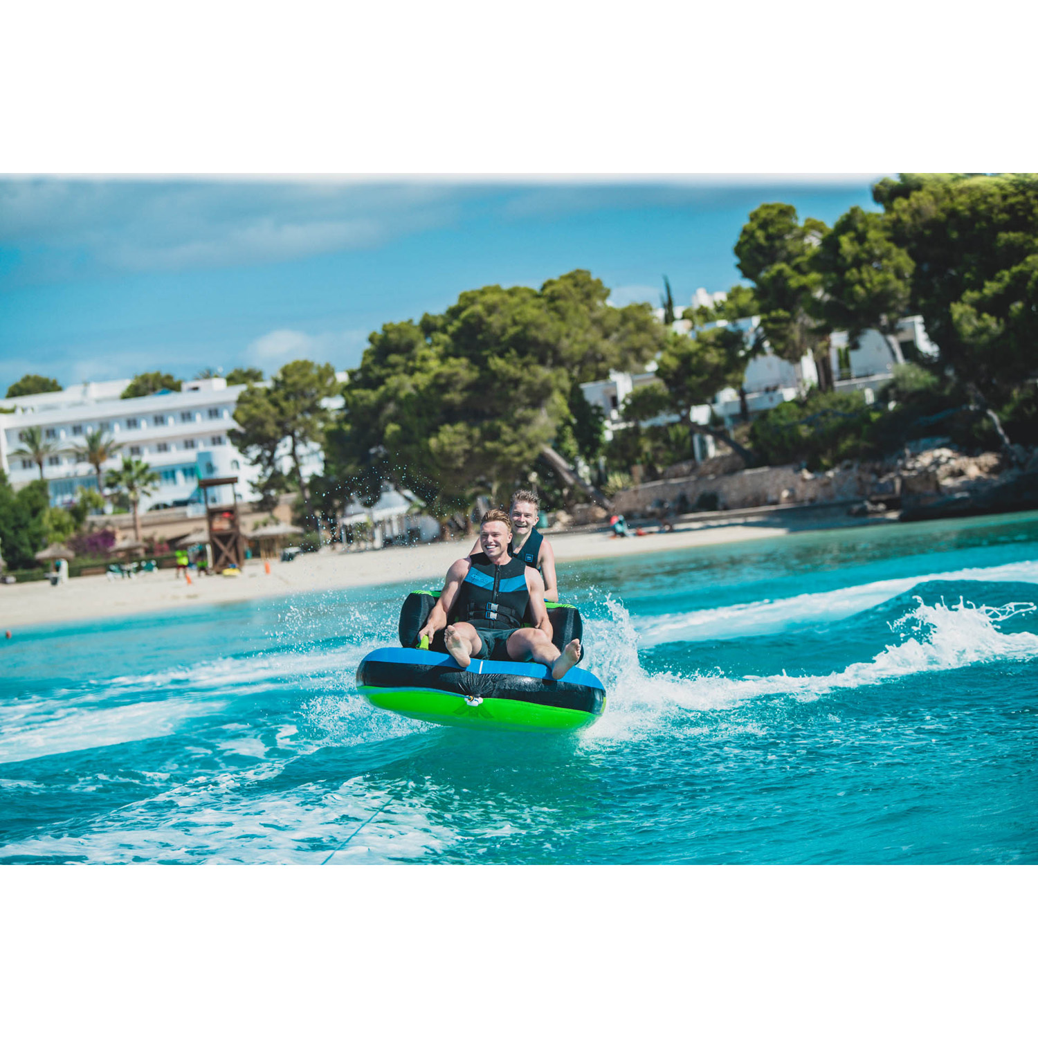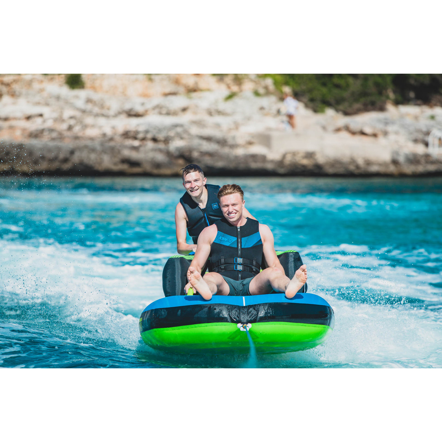 A fantastic towable tube for some thrilling water activities! The 4 handles with neoprene knuckle guards provide both comfort and grip for a safe and enjoyable experience. Have a great time out on the water!