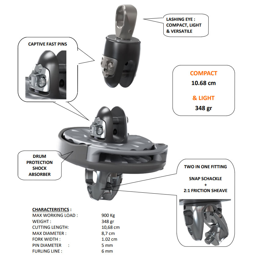 This extremely lightweight furler contains super low friction bearings specifically designed to increase performance. With a composite spool around the drum to protect the sail, the drum and the deck from impacts.