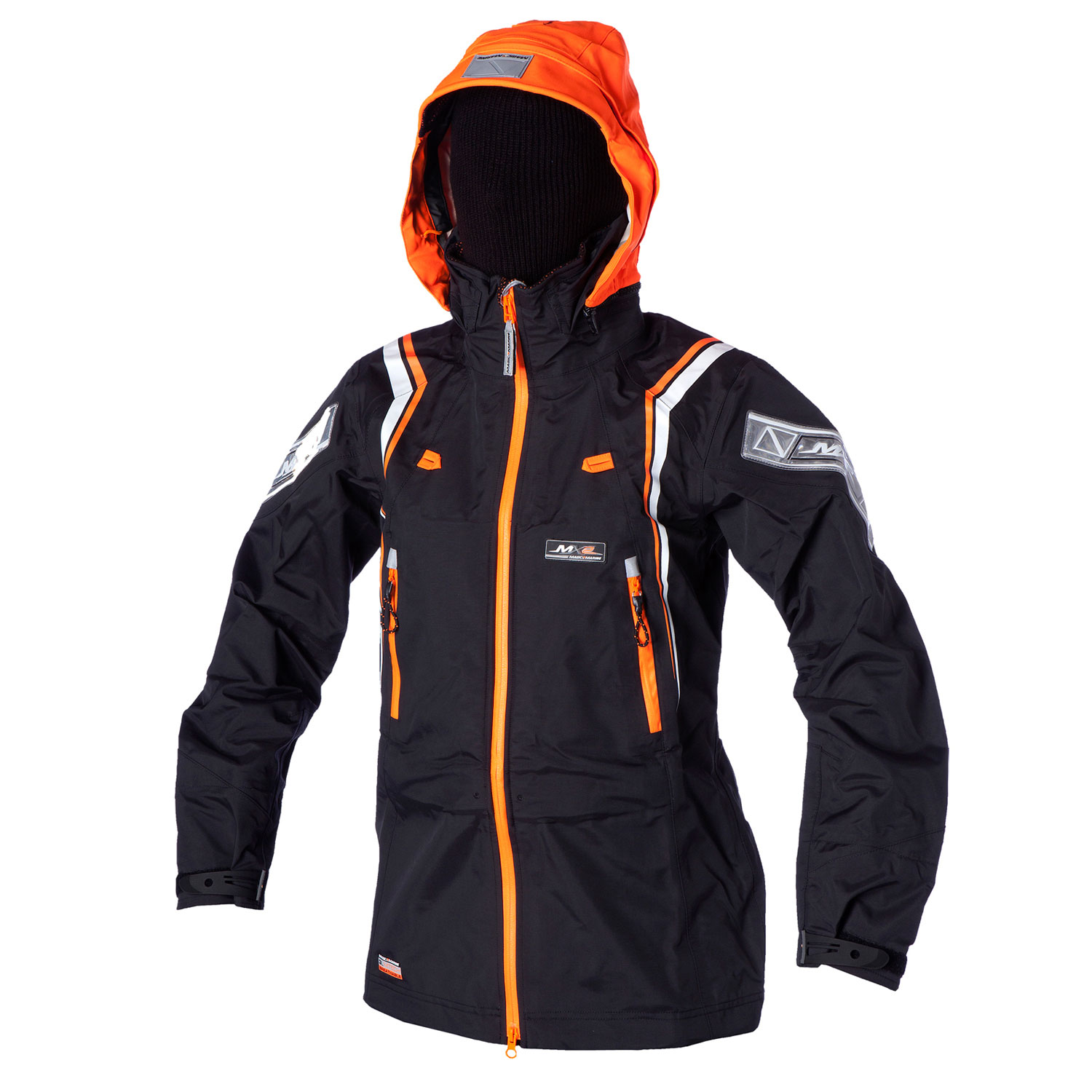 Self-draining chest pockets with waterproof zippers and reflective zipper garage
