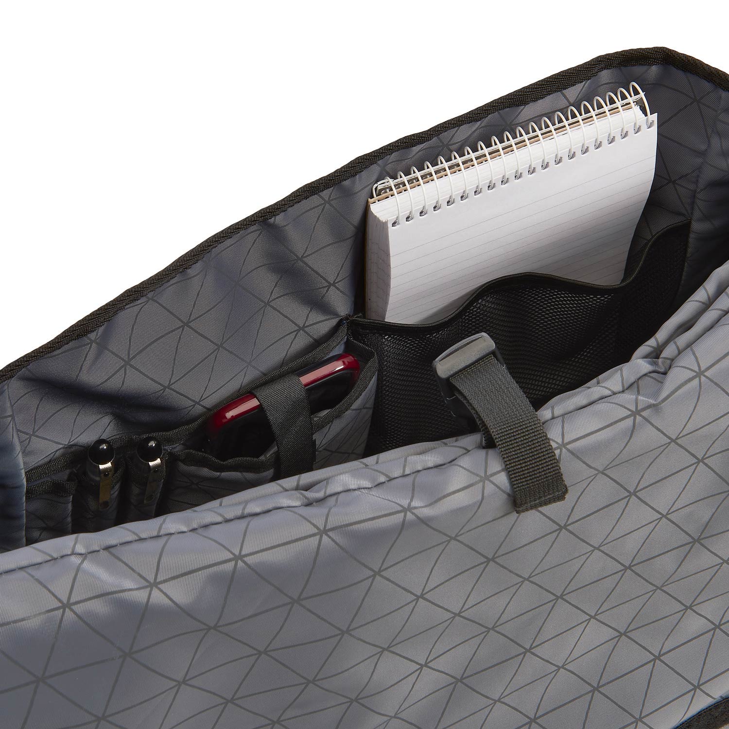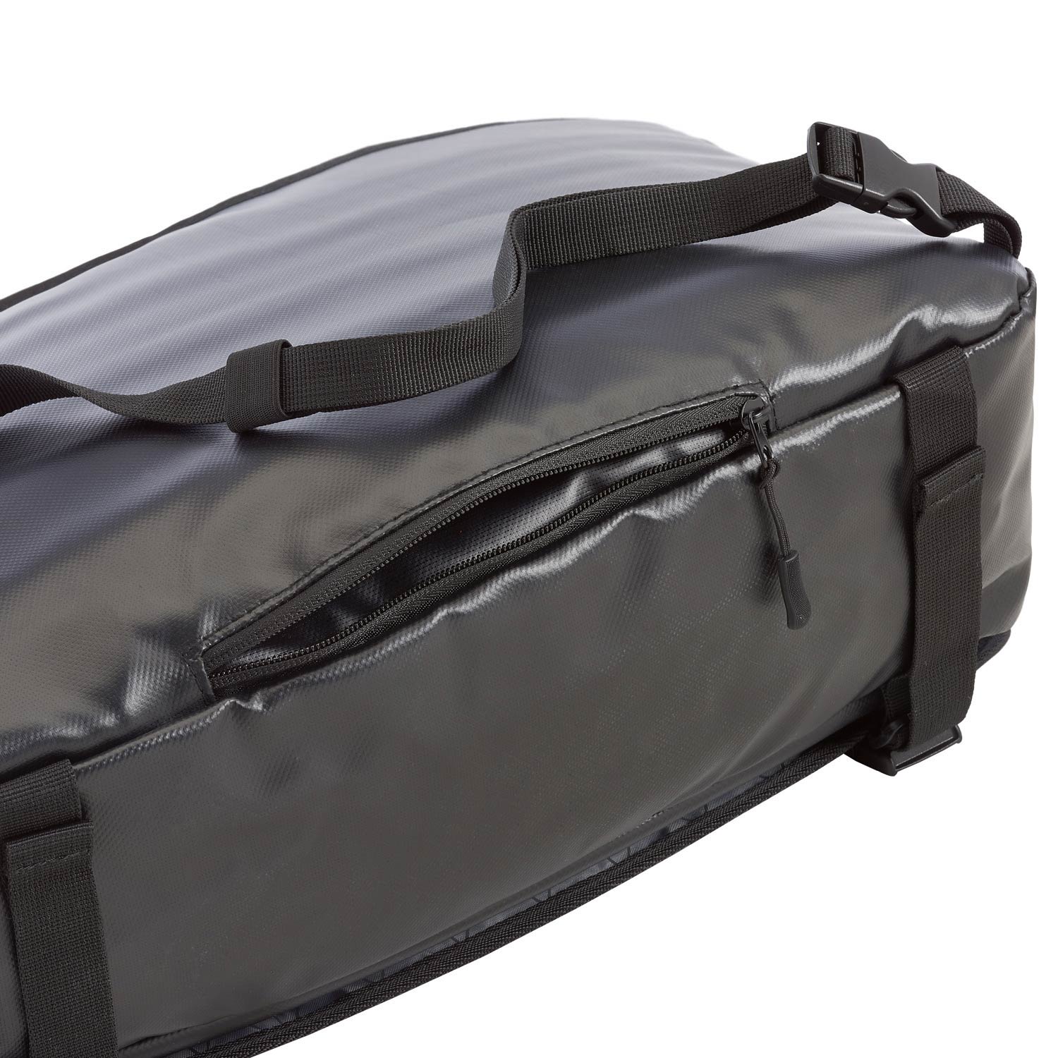 - Slip pocket with hook and loop for securing to roll-on bags