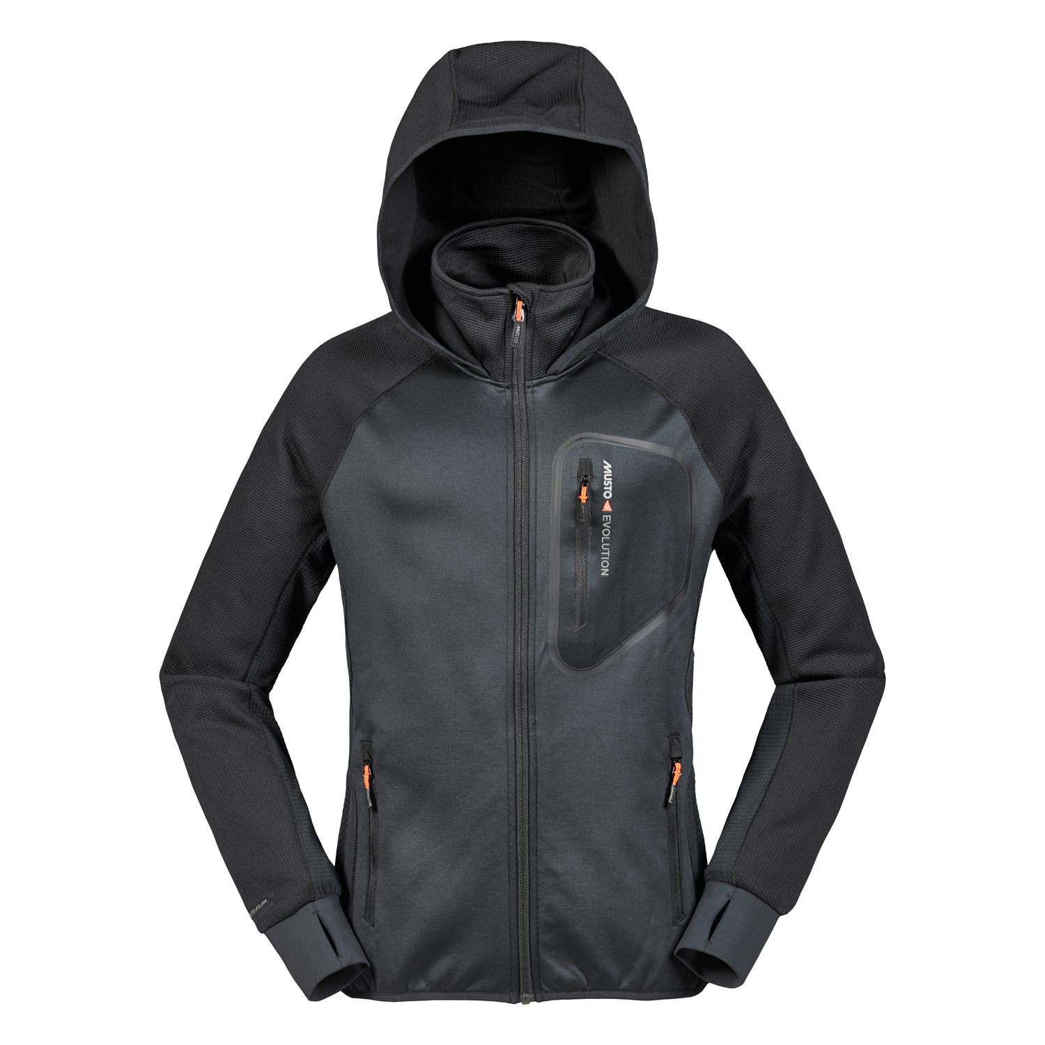 This technical Tri-Map Hoody Fleece is body mapped with different fleeces to optimise comfort and fit. The underarms and sides use grid fleece for extra ventilation. The smooth face fleece on the torso traps body heat for warmth in crucial areas, and the fleece hood and upper arms are patterned for a sleek, athletic look.