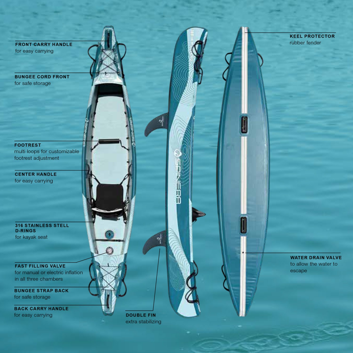 Whether you're setting off on a long water excursion or simply heading out for a relaxed fishing trip, the Spinera Kenai 130 is your reliable companion for any adventure. Hop in and experience a new dimension of kayaking!