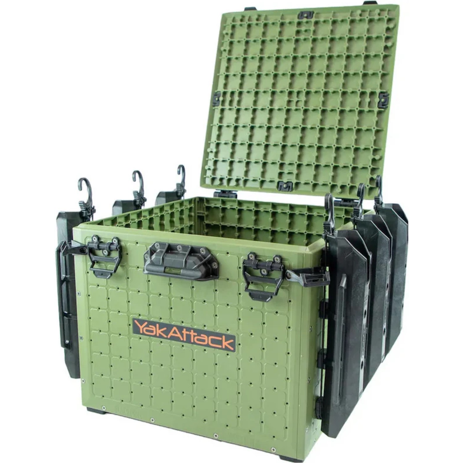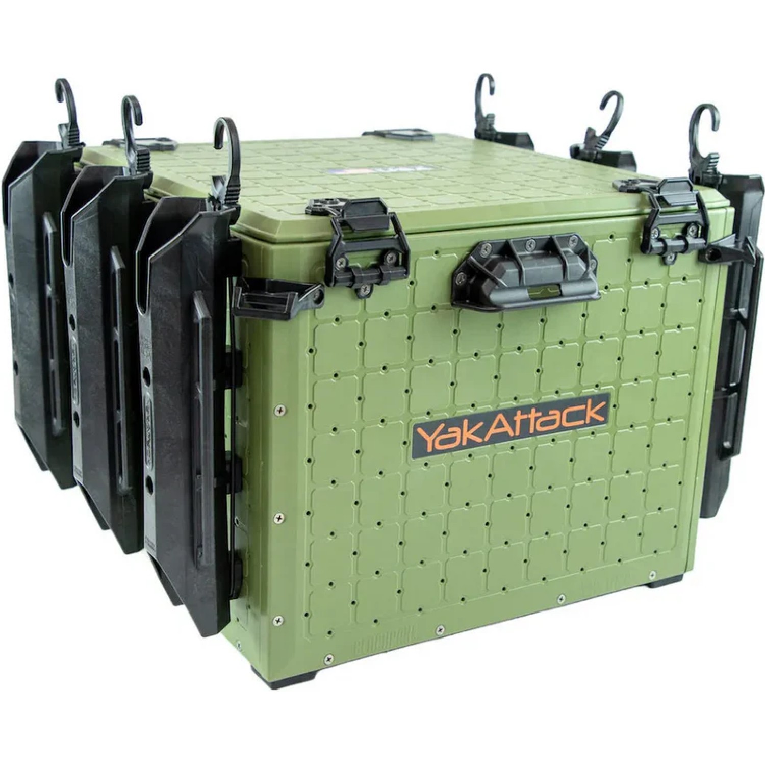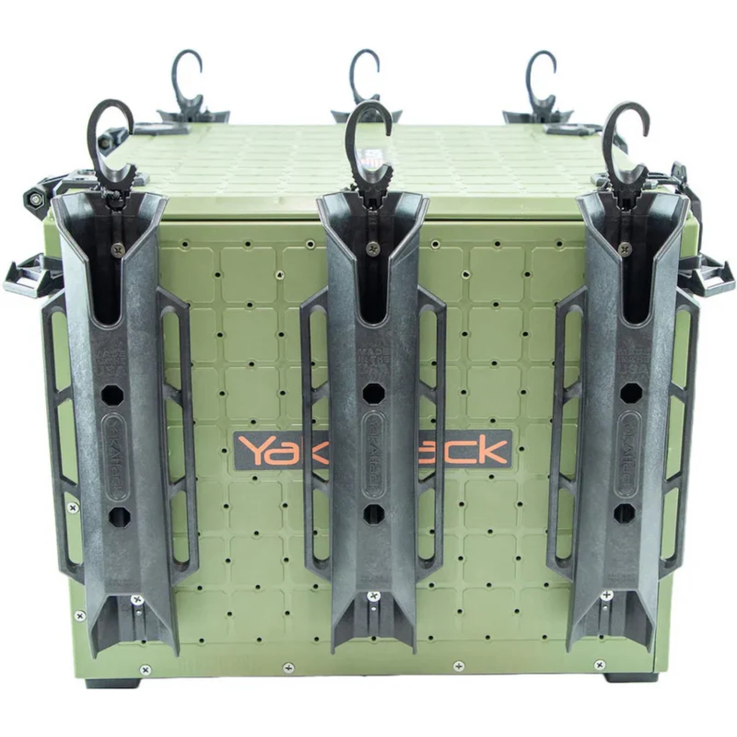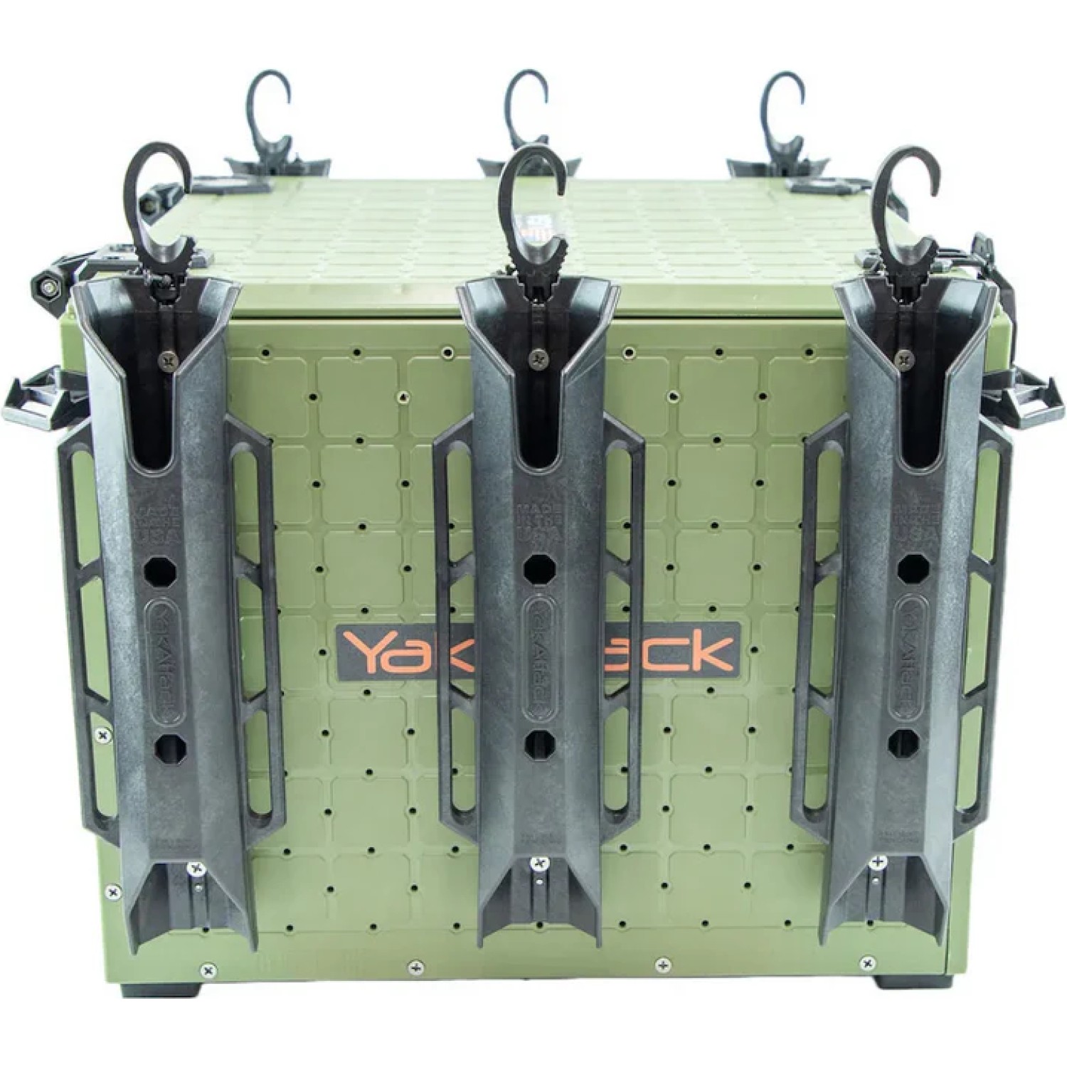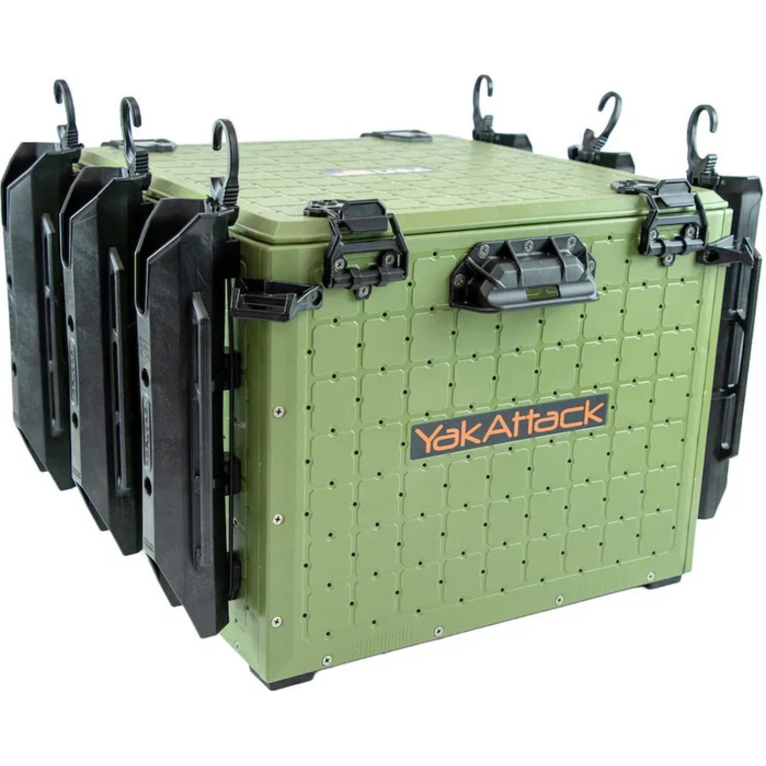 Rubber feet offer noise dampening and isolation, while Omni corner brackets enable multiple hold-down methods. They are designed as attachment points for YakAttack OmniHooks (four of which are included), generic hooks, carabiners, or simple bungee.